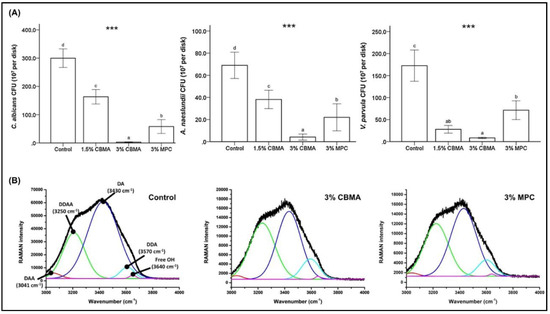 (A) Resistance to adherence against fungi and bacteria with addition of CBMA, showing improved performance compared to both the control group and MPC at 3 wt.%. (B) Collective band Raman spectroscopy observed for 3% CBMA and 3% MPC. MPC—2-methacryloyloxyethyl phosphorylcholine, CBMA—carboxybetaine methacrylate. The difference in the lower case letters indicate a significant difference between the groups. *** p < 0.001. Reproduced with permission from Jie et al. [89]; published by Elsevier, 2020.