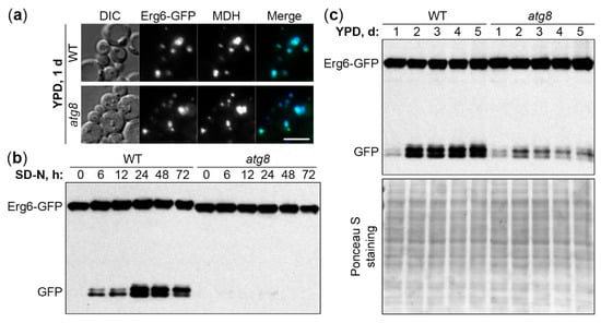 To develop K. phaffii as a new lipophagy model, we used the established LD marker protein, Erg6 [10,11,12], tagged with the green fluorescent protein (GFP) on the integrative plasmid, pRK2. To confirm the localization of Erg6-GFP to LDs, wild-type (WT) PPY12h cells with pRK2 integrated into the HIS4 locus were grown in YPD medium for 1 d to an early S-phase and stained with a blue LD dye, monodansylpentane (MDH) [15]. The Erg6-GFP displayed a complete co-localization with MDH (Figure 1a), suggesting that it is a good LD protein marker for K. phaffii under our experimental conditions. The lack of a key Atg protein, Atg8, did not affect the localization of Erg6-GFP to LDs in atg8 cells (Figure 1a), making it possible to use the Erg6-GFP as a lipophagy reporter.