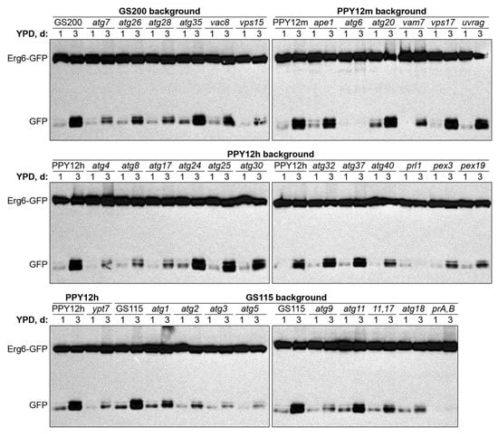 Then, we developed two Erg6-GFP processing assays to monitor lipophagy: One after the transfer of cells from early S-phase in YPD medium to N-starvation in SD-N medium and another one after the prolonged S-phase in YPD medium. When the LDs with Erg6-GFP are delivered from the cytoplasm to the vacuole, Erg6, but not GFP moiety, is degraded by vacuolar proteases resulting in free GFP, which can be detected by Western blot [16]. The processing of Erg6-GFP to GFP in WT (PPY12h) cells culminated after 24 h of N-starvation (Figure 1b) and after 2-3 days in YPD medium (Figure 1c). Therefore, we picked 0 and 24 h, and 1 and 3 d time-points for the N-starvation and S-phase lipophagy assays, respectively.