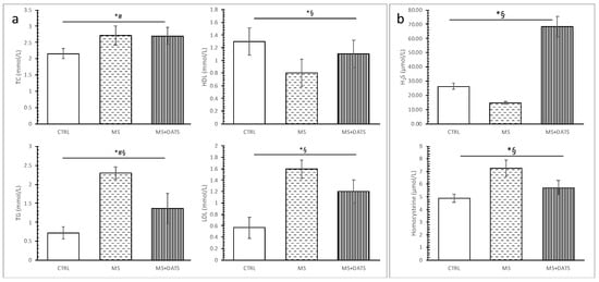 Effects of diallyl trisulfide (DATS) consumption on (a) lipid parameters: TC—total cholesterol, TG—triglycerides, HDL—high-density lipoprotein and LDL—low-density lipoprotein; (b) H2S—hydrogen sulfide and homocysteine levels. Values are presented as mean ± SD, n = 12, per group. * p < 0.05 CTRL vs. MS, # p < 0.05 CTRL vs. MS+DATS, § p < 0.05 MS vs. MS+DATS.