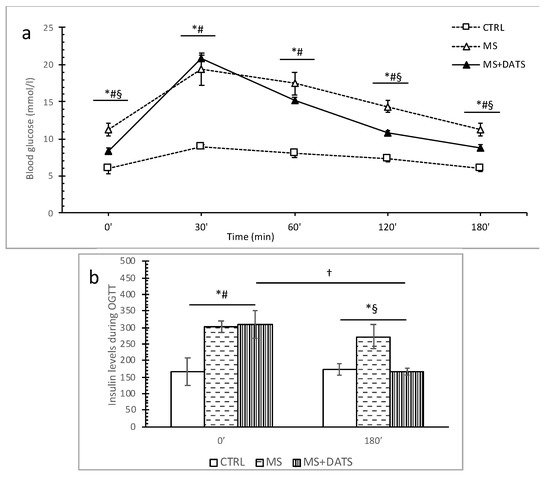 Effect of DATS consumption on glucose and insulin level during oral glucose tolerance test (OGTT). (a) Fasting blood glucose level (0′) and blood glucose levels 30′, 60′, 120′ and 180′ after an oral glucose loading (2 g/kg body weight); (b) fasting insulin levels and 180’ after an oral glucose loading. Values are presented as mean ± SD, n = 6, per group. * p < 0.05 CTRL vs. MS, # p < 0.05 CTRL vs. MS+DATS, § p < 0.05 MS vs. MS+DATS, † p < 0.05 MS at 0′ vs. MS at 180′.
