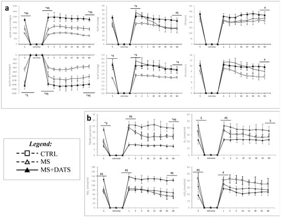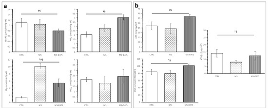 Effects of DATS consumption on oxidative stress parameters; (a) pro-oxidants: TBARS—index of lipid peroxidation, O2−—superoxide anion radical, NO2−—nitrite, H2O2—hydrogen peroxide; (b) antioxidants: CAT—catalase, GSH—reduced glutathione peroxide and SOD—superoxide dismutase. Values are presented as mean ± SD, n = 12, per group. * p < 0.05 CTRL vs. MS, # p < 0.05 CTRL vs. MS+DATS, § p < 0.05 MS vs. MS+DATS.
