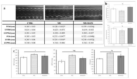 Effects of DATS consumption on in vivo cardiac function: (a) cardiodynamic parameters, representative M-mode echocardiography findings; (b) fractional shortening and ejection fraction; (c) SBP—systolic blood pressure, DBP—diastolic blood pressure and HR—heart rate. Values are presented as mean ± SD, n = 12, per group. * p < 0.05 CTRL vs. MS, # p < 0.05 CTRL vs. MS+DATS, § p < 0.05 MS vs. MS+DATS.