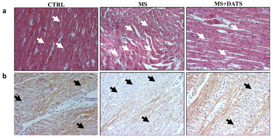 I/R-induced cardiac histo-architectural variation was analyzed using hematoxylin/eosin staining that confirms the perturbed structure in MetS rat heart. Namely, in MS group extensive edema, cell swelling, and tissue necrosis (infarcted) zone with separation of muscle fibers were found. On the other hand, histological alterations were considerably reduced in DATS-treated group where mild edema, reduced inflammatory process and reduced necrotic area were obtained (Figure 6a). These ultrastructural changes were further confirmed with cardiac troponin T (cTnT) staining. As shown in Figure 6b in MS group there was an obvious loss of cTnT staining and slightly positive (brown) staining, while in the MS+DATS group, there was a decrease in staining with more intense (brown color) remaining found.