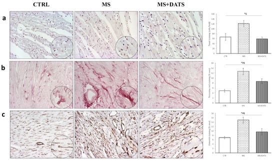 Representative heart tissue sections of (a) immunostaining of myocytes with terminal deoxynucleotidyl transferase dUTP nick end labeling (TUNEL) positive nucleus; (b) picrosirius red staining; (c) vimentin content. Values are presented as mean ± SD. * p < 0.05 CTRL vs. MS, # p < 0.05 CTRL vs. MS+DATS, § p < 0.05 MS vs. MS+DATS. Original magnification 20× and 40×.