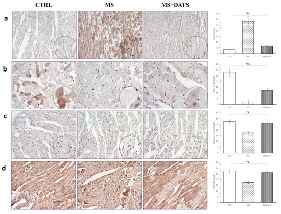 Representative heart tissue sections of immunohistochemical staining of (a) Bax; (b) Bcl-2; (c) Caspase-3; (d) heat shock protein 70. Values are presented as mean ± SD. * p < 0.05 CTRL vs. MS, # p < 0.05 CTRL vs. MS+DATS, § p < 0.05 MS vs. MS+DATS. Original magnification 20× and 40×.