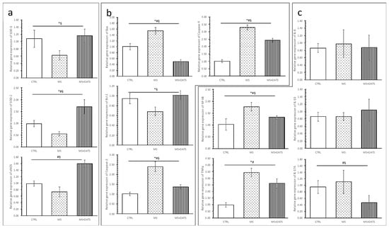 Effects of DATS consumption on relative gene expression of: (a) antioxidative: SOD-1—superoxide dismutase 1, SOD-2—superoxide dismutase 2, eNOS—endothelial nitric oxide synthase; (b) (anti)apoptotic: Bcl-2—B-cell lymphoma 2, Bax, caspase-3, caspase-9; (c) (anti)inflammative parameters: NF-κB, TNF-α, IL-6, IL-10, IL-17A. Values are presented as mean ± SD, n = 12, per group. * p < 0.05 CTRL vs. MS, # p < 0.05 CTRL vs. MS+DATS, § p < 0.05 MS vs. MS+DATS.