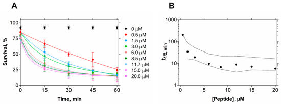 In contrast, in the conditions tested, EcDBS1R4 has no hemolytic potential against erythrocytes, indicating the human safety of this peptide. To gain an insight into the kinetics of its killing activity, we followed bacterial viability at different peptide concentrations and different incubation times, using flow cytometry (Figure 1). We found that bacterial lifetime is reduced at larger peptide concentrations. We estimated the time necessary to achieve 50% of compromised cells (t1/2) for all concentrations [32], and found that a 10 min exposure to 6 µM EcDBS1R4 is enough for kinetic stabilization of the antimicrobial activity (Figure 1B).