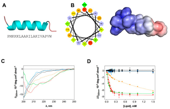 In silico and experimental structural studies of EcDBS1R4 structure. (A) Amino acid sequence of EcDBS1R4 and theoretical three-dimensional structure predicted by homology and constructed using Modeller v. 9.12. (B) α-helical wheel (constructed using the server http://rzlab.ucr.edu/scripts/wheel/wheel.cgi; hydrophobic residues are represented as green diamonds, hydrophilic, non-charged residues are coded as orange circles, and positively charged residues are blue-grey pentagons) and adaptive Poisson-Boltzmann solver electrostatic potential of EcDBS1R4, ranging from −5.0 kBT/e (red) to +5.0 kBT/e (blue). (C,D) Experimental structural studies of EcDBS1R4 in the presence of different LUV compositions. (C) Circular dichroism spectra of EcDBS1R4 in solution (dotted black) at 16 µM, and in the presence of 500 µM of lipid vesicles of POPC (black), POPC:Chol (70:30) (blue), POPC:POPG (70:30) (red), inner (green) and outer (orange) membrane of E. coli mimetic systems. (D) Comparative plot of the θ signal at 222 nm (a local minimum for α-helices) at different lipid concentrations, with the same lipid composition described above. Solid lines represent fits to the experimental data using Equation (1). Each experiment was conducted in triplicate and represented as mean ± standard deviation (SD). Calculated parameters are presented in Table 2.