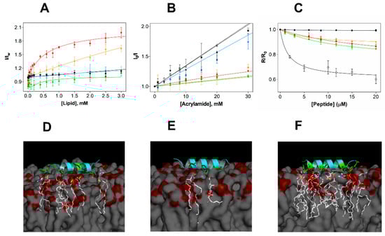 Experimental and in silico studies of the membrane selectivity of EcDBS1R4. (A) Partition curves of 6 µM EcDBS1R4 to LUVs of different compositions. Solid lines represent fits obtained using Equations (2) and (3). The LUV compositions used were POPC (black), POPC:Chol 70:30 (blue), POPC:POPG 70:30 (red), IML (POPE:POPG:CL 63:33:4) (green) and OML (POPE:POPG:CL:LPS 80:16:1:3) (orange). (B) Fluorescence quenching by acrylamide of 6 µM EcDBS1R4 in the absence (open circles) and presence of LUVs (color code as in A). Solid lines represent fits obtained using Equations (4) and (5). (C) Changes in membrane dipole potential as a function of EcDBS1R4 concentration, measured with di-8-ANEPPS (4-(2- [6-(dioctylamino)-2-naphthalenyl]ethenyl)-1-(3-sulfopropyl)pyridinium inner salt) in LUVs (200 µM lipid concentration; color code as in A) and E. coli cells (1 × 104 cells/mL), represented by grey filled circles. The plot represents the di-8-ANEPPS excitation ratio R (I455nm/I525nm) for each peptide concentration, normalized divideing by R0 (the R value in the absence of peptide). Solid lines represent fits obtained using Equation (6). The parameters obtained from the fittings are summarized in Table 2. All experiments were conducted in triplicate. (D–F) Three-dimensional theoretical representation of the peptide interacting with membranes composed of POPC (D), POPC:Chol (70:30) (E) and POPC:POPG (70:30) (F), indicating the amino acid residues (in green) and the phospholipid molecules (in white) possibly involved in the interactions (residues involved and distances of interactions occurring for each membrane are detailed in Supporting Information Table 1).