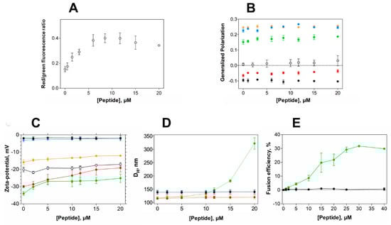 Alterations in membrane properties induced by EcDBS1R4. (A) Effect of EcDBS1R4 on the transmembrane potential of E. coli cells, calculated from the DiOC2(3) green shift. (B) Generalized polarization of LUVs (3 mM lipid) and E. coli cells (1 × 104 cells/mL) labelled with Laurdan, as a function of peptide concentration. (C) Zeta-potential of LUVs (200 µM lipid) and E. coli cells as a function of peptide concentration. (D) Hydrodynamic diameter of LUVs (200 µM lipid), measured by dynamic light scattering as a function of EcDBS1R4 concentration. (E) Fusion/hemifusion efficiency of IML (PE:PG:CL (63:33:4)) LUVs (200 µM lipid) as a function of peptide concentration, calculated using Equation (8). The LUV compositions used were POPC (black), POPC:Chol 70:30 (blue), POPC:POPG 70:30 (red), IML (POPE:POPG:CL 63:33:4) (green) and OML (POPE:POPG:CL:LPS 80:16:1:3) (orange). E. coli cells are represented by grey open circles. All experiments were conducted in triplicate. Data are presented as mean ± SD.