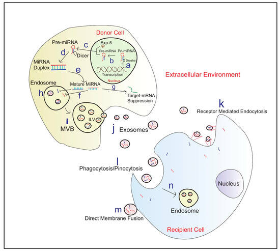 Exosome biosynthesis and miRNA Communication between cells a—Translation of primary miRNA (Pri-miRNA) from DNA; b—Cleavage of pri-miRNA to precursor miRNA(Pre-miRNA) by microprocessor complex including Drosha; c—Exportation of Pre-miRNA to the cytoplasm by Exportin 5(EXP-5); d—Pre-miRNA processing into miRNA duplexes using Dicer; e—Duplex unwinds to produce mature miRNA; f—miRNA engulf into endosomes; g—Few miRNA’s contribute to target mRNA silencing in the Donor cell; h—Endosomes engulfed miRNA; i—Micro-vesicular Bodies (MVB) release Intraluminal Vesicles (ILV) fuse with the plasma membrane j—Exosomes carrying miRNAs; k—Exosome entry to recipient cell via receptor-mediated endocytosis; l—Entrance of exosomes via Phagocytosis/Pinocytosis; m—Exosome entry via Direct membrane fusion; n—Formation of Endosome in the recipient cell and then exosomal miRNA release into the cytoplasm.