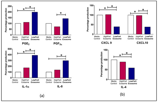 Differential expression of cytokines in bovine endometrial cells (a) Increased relative fold expression of prostaglandin E2 (PGE2), prostaglandin F2 alpha (PGF2α), interleukin 1 alpha (IL1α), (C-X-C motif) ligand 8/interleukin-8 (CXCL8/IL8) in low fertile exosome loaded cells. (b) Decreased relative fold expression of (C-X-C motif) ligand 9 (CXCL9), (C-X-C motif) ligand 10 (CXCL10) and interleukin 4 (IL-4). Differences of P < 0.05 are considered statistically significant between sample groups denoted by *. Adapted by experimental data published in Koh et al., 2020 [9].