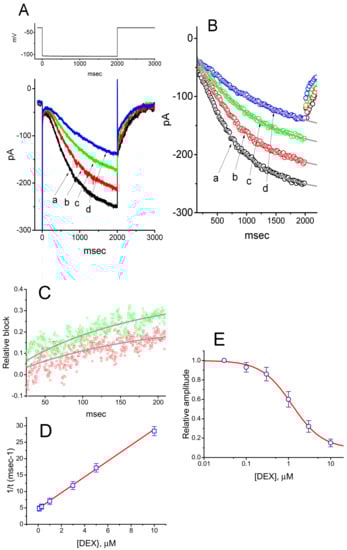 Hyperpolarization-activated cation current (Ih) has been recognized as a key determinant of repetitive electrical activity in heart cells and in a variety of neurons, and neuroendocrine or endocrine cells [11,12,13,14,15,16,17]. This current is a mixed inward Na+/K+ current (i.e., unusual ion selectivity in that it conducts both Na+ and K+ ions), which is sensitive to block by CsCl or ivabradine [14,17,18]; and activation of this current at resting membrane potentials can result in a net inward current carried largely by Na+, which will depolarize the membrane potential to the threshold required for the elicitation of action potential (AP) [17,18]. It was assumed to be carried by channels of the hyperpolarization-activated cyclic nucleotide-gated (HCN) gene family, which belongs to the superfamily of voltage-gated K+ channels and cyclic nucleotide-gated channels. To date, how DEX can interact with HCN channels to modify the amplitude and/or gating of Ih still remains unexplored.