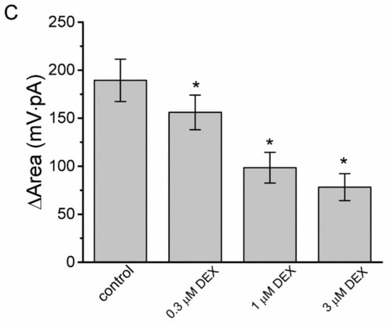 3.3. Effect of DEX on the Voltage-Dependent Hysteresis Elicited in Response to Long-Lasting Triangular Ramp Pulse