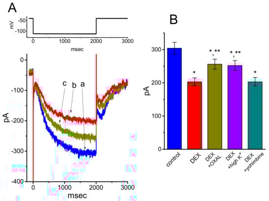 We next explored whether the suppressive effect of DEX on Ih could be modified by subsequent addition of OXAL, high-K+ solution, or yohimbine. OXAL was recently reported to elevate Ih amplitude [28], challenging cells with high K+ solution has been shown to increase Ih amplitude [12,29,30], and yohimbine was reported to be an antagonist of α2-adrenergic receptors [31]. As revealed in Figure 4A,B, subsequent application of OXAL, still in continued presence of 1 μM DEX, was efficacious at attenuating DEX-mediated suppression of Ih measured at the end of the hyperpolarizing voltage pulse. As cells were continually exposed to 1 μM DEX, a further rise of extracellular K+ concentration to 20 mM also counteracted Ih suppressed by DEX (Figure 5B). However, unlike the experimental results made in previous observations [8], subsequent addition of 10 μM yohimbine, an antagonist of α2-adrenergi receptor, did not result in any alterations on DEX-induced inhibition of Ih in GH3 cells.