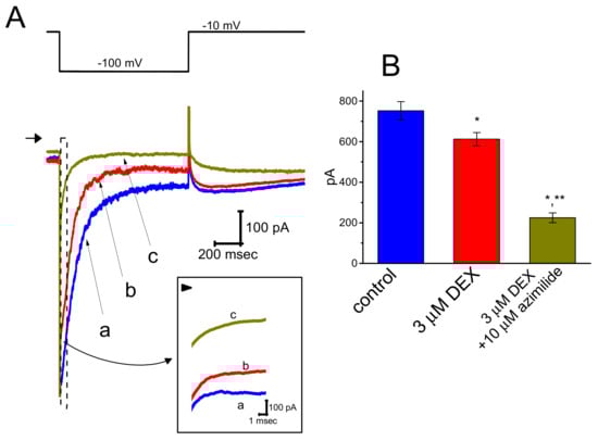 In a separate set of experiments, we continued to test whether the presence DEX can modulate different type of K+ currents, (i.e., IK(erg)), identified in these cells. The experiments were conducted in cells bathed in high-K+, Ca2+-free solution and the recording electrode used was filled up with the K+-containing solution. As illustrated in Figure 5, DEX at a concentration of 3 μM was noted to mildly suppress the amplitude of deactivating IK(erg), as revealed by a significant reduction of current amplitude from 752 ± 45 to 612 ± 33 pA (n = 8, p < 0.05). Moreover, still in the presence of DEX, further addition of azimilide (10 μM), an inhibitor of IK(erg), was capable of depressing IK(erg) significantly to 225 ± 24 pA (n = 8, p < 0.05). Therefore, as compared with its suppressive action on Ih, the IK(erg) in GH3 cells appear to be less vulnerable to suppression by DEX.