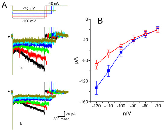 Effect of DEX on I–V relationship of Ih recorded from pheochromcytoma PC12 cells. (A) Representative Ih traces elicited by different hyperpolarizing steps from a holding potential of −40 mV (as indicated in the uppermost part of (A)). a: control; b: in the presence of 1 μM DEX. (B) Averaged I–V relationships of Ih amplitude taken from the absence (■) or presence (□) of 1 μM DEX (mean ± SEM; n = 8 for each point). Current amplitude was measured at the end of each hyperpolarizing step potential. Note that, in PC12 cells, DEX was capable of suppressing Ih measured at the voltages ranging between −100 and −120 mV.