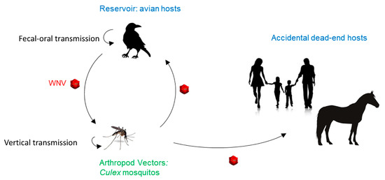 WNV is an arbovirus that is amplified in a bird–mosquito–bird enzootic transmission cycle, with wild birds as the primary hosts [47]. Humans and other mammals are considered to be accidental or dead-end hosts (Figure 1).