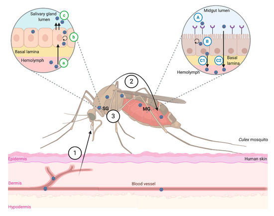 Dissemination steps of WNV in the invertebrate vector. (1) Mosquito feeds on virus-infected blood. (2) WNV infects mosquito midgut: (A)—Virus binds to epithelial cells by a protein receptor. (B)—Viral replication in midgut cells. (C1)—Direct passage from basal lamina to hemolymph (1st way). (C2)—Direct paracellular passage through midgut cells (2nd way). (3) Dissemination of WNV to other organs like salivary glands: (a)—Infection of epithelial cells by direct passage from hemolymph to cells. (b)—Viral replication in epithelial cells. (c)—Release of virus from cells to salivary gland lumen, with or without apoptosis of epithelial cells (inspired by [68,69]).