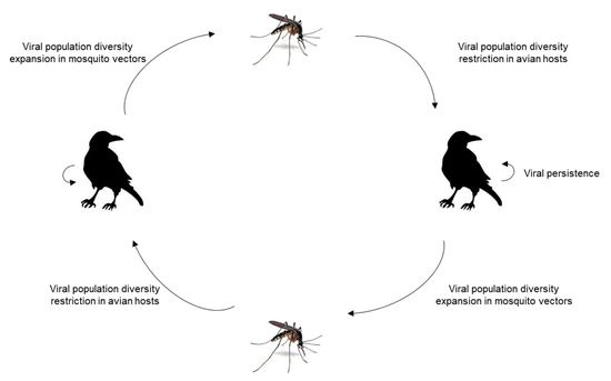 Some genetic changes are favorable to WNV transmissibility, thereby facilitating expansion of the WNV [71,72]. It is well documented that natural WNV infections are derived from a genetically diverse population of viral genomes. Within an individual host, WNV exists as a genetically heterogeneous mixture of variants that differ from a consensus nucleotide sequence; this population structure is referred to as a viral quasispecies [72,73]. WNV populations within field mosquitoes are more genetically diverse than those found in naturally infected birds. This results from several bottlenecks that shape the virus divergence during the progress of infection in birds, including the host defenses, varying cellular environments in different tissues, and anatomic barriers, such as the BBB. These multiple selective pressures determine tissue tropism and virus pathogenesis. Moreover, Jerzak and colleagues serially passaged a genetically homogenous population of WNVs in either mosquitoes or birds, and observed greater intra-host genetic diversity in mosquitoes than does chickens [74] (Figure 4). It is noteworthy, however, that most avian studies have involved fowl in which the replication of WNV is poor.