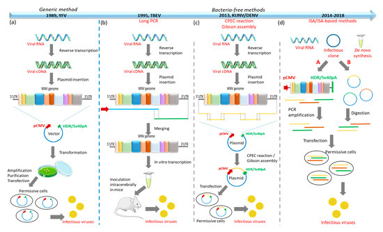 Overview of the main reverse genetic methods. (a) First generic method for reverse genetics developed in 1989 for YFV. cDNA was produced from viral single-stranded RNA, and then inserted into a plasmid upstream of a pCMV promoter and downstream of the hepatitis delta ribozyme, followed by the simian virus 40 polyadenylation signal (HDR/SV40(pA)) sequence. After amplification and purification, the construction was introduced into permissive cells by transfection, and infectious clones were obtained. (b) Bacteria-free method used for TBEV in 1995. Two long PCR products were synthetized and joined by using restriction enzymes or fusion PCR. After in vitro transcription, infectious clones were generated after intracerebral inoculation of mice with the long PCR fragment. (c) Bacteria-free method using the CPEC (KUN) or Gibson reaction (DENV), 2013. Multiple PCR amplicons were inserted into a plasmid containing pCMV and HDR/Sv40(pA) sequences and joined by CPEC or Gibson reaction. Infectious clones were obtained after transfection of permissive cells. (d) New bacteria-free method for reverse genetics in flaviviruses. (A)—In the infectious subgenomic amplicons (ISA) method the genetic material consists of viral RNA, infectious clones, or de novo synthesis. PCR products that cover the entire genome are used for direct transfection of permissive cells. (B)—The new ISA-based reverse genetic method, called the subgenomic plasmids recombination method (SuPReMe), resembles the ISA method, but the genome fragments are cloned into plasmids at the restriction sites. After restriction enzyme digestion, genomic fragments are used for transfection of permissive cells, and infectious clones are produced (according to [79]).