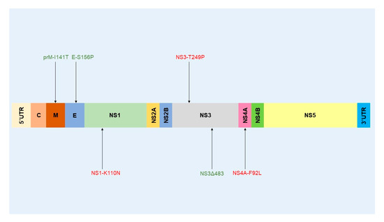 Virulence determinants in the WNV genome found in mammalian hosts. Molecular virulence determinants found in vitro or in vivo in mammalian cells (Vero, A549) and mouse models are represented throughout the entire WNV genome. Green: mutations involved in the attenuated viral phenotype. Red: mutations involved in the more virulent viral phenotype (adapted from [88]).