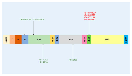 - Khou, C.; Pardigon, N. Identifying Attenuating Mutations: Tools for a New Vaccine Design against Flaviviruses. Intervirology 2017, 60, 8–18. [Google Scholar] [CrossRef]