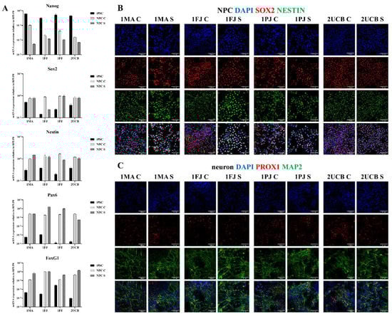 Figure 1b and Figure S1b demonstrate the morphology and immunocytochemical features of NPCs, while Figure 1c illustrates the differentiated neurons thereof. We found that both the iPSC-derived cNPCs and the shortcut sNPCs showed double positive staining for transcription factor SRY (sex determining region Y)-box 2 (SOX2) and intermediate filament Nestin in all samples. Moreover, all NPC-derived DG neural cultures showed intensive staining for microtubule-associated protein 2 (MAP2), highlighting the neuronal identity and morphology, and were partially positive for the DG-specific transcription factor prospero homeobox protein 1 (PROX1).