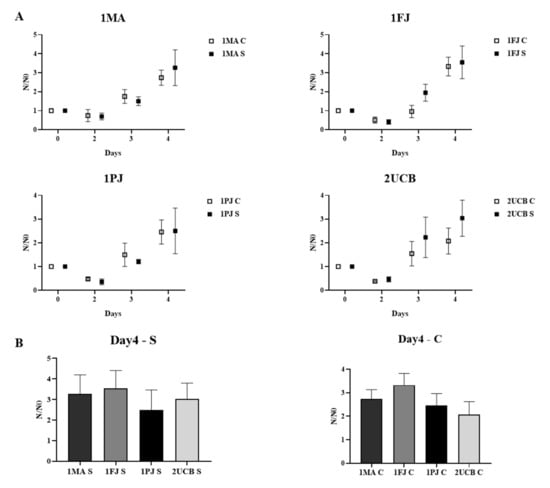 Comparison of the proliferative capacity of neural progenitor cells (NPCs) by flow cytometry (FCM) measurements. (A) Cell counts relative to seeded cell numbers are plotted per day; cNPCs and sNPCs derived from the same blood sample are placed side by side. (B) Cell counts (N) relative to seeded cell number (N0) on day 4 are compared between all cNPC lines and all sNPC lines. Values represent the means ±SEM of from at least 3 biological and 3–3 technical parallels.