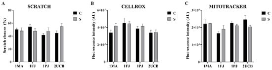 Functional analysis of neural progenitor cells (NPCs): (A) scratch assay. Average percentage of scratch closure calculated from two biological parallel experiments (three technical replicates each). Values represent means ± SEM. (B) Levels of reactive oxygen species (ROS) accumulation estimated by the CELLROX™ Green Reagent. Green fluorescence intensities—proportional to ROS levels—of NPCs after incubation with the reagent were measured by FCM (Flow Cytometry) with the exclusion of dead cells by propidium iodide staining. The averages of the medians of green fluorescence intensities ± SEM in at least three replicates are shown. (C) Mitochondrial functions compared by MitoTracker™ red reagent. NPCs—priory plated on 8-well confocal chambers—incubated with the reagent, were fixed by paraformaldehyde (PFA) and their nuclei were stained by DAPI (2-(4-amidinophenyl)-1H-indole-6-carboxamidine). Fluorescent images were taken in high content screening system on the whole surface of the chambers. Two biological parallels were evaluated (at least 25 frames each), and the averages of integrated red fluorescence intensities relative to cell counts and ±SEM are represented.