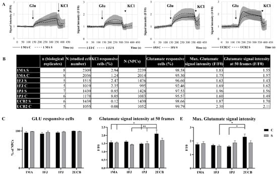 To examine the glutamate signaling in our model, we performed a detailed characterization of the glutamate-induced calcium signals using Fluo-4 (Thermo Fisher Scientific, Waltham, MA, USA) loaded NPC cultures. Figure 4a shows typical calcium signals obtained after treating the cells with 100 µM glutamate, followed by 50 mM KCl. As documented, after the addition of glutamate, all types of NPCs responded with well-measurable calcium signals, while the cells did not show significant calcium response after KCl treatment. It has been noted previously [] that NPCs do not respond to KCl, and only the partially differentiated cells (>10% of the NPC cultures) show a weak signal in this case. Therefore, these cells were excluded from further analysis. We analyzed hundreds of cells (Figure 4b) and found no significant differences in the number of responding cells or signal intensities after addition of glutamate when comparing the patient-specific NPCs to NPCs derived from his parents (Figure 4c–e). The only statistically significant alteration was seen in the case of UCB2-derived classic NPCs, where a steeper increase of the Ca-signal was observed (Figure 4a,c and Table S4).