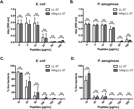Antibacterial properties of LL-37 (native peptide) and hArg-LL-37 (synthetic peptide in which arginine residues were substituted for by citrullination-resistant homoarginine residues). Antimicrobial activity of LL-37 and hArg-LL-37 was assessed using a microdilution method as a standard protocol. The MIC (minimal inhibitory concentration) of tested peptides against Gram-negative (A) E. coli and (B) P. aeruginosa. Mean ± SD n = 2. ns—non-significant; Bactericidal effect of LL-37 and hArg-LL-37 on (C) E. coli and (D) P. aeruginosa were determined using SYTO9 and PI staining. Bacteria were treated with peptides (0–200 μg/mL) for 2 h and stained with SYTO9 and PI. The fluorescence was measured (excitation at 485 nm and emission at 530 nm (SYTO9) and 630 nm (PI)). Mean ± SD n = 3; ns—non-significant.