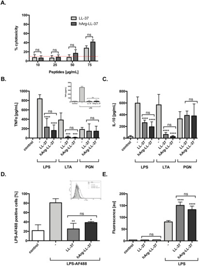 Immunomodulatory activities of LL-37 and hArg-LL-37. (A) The toxicity of LL-37 and hArg-LL-37 on HaCaT cells was evaluated using the LDH assay. Cells were plated on 96-well plates and incubated overnight. Next, macrophages were treated with the peptides at different concentrations (10–75 μg/mL) for 24 h. Mean ± SD n = 2. ns—non-significant. Human MDMs were stimulated with 10 ng/mL LPS, 10 μg/mL LTA and 10 μg/mL PGN in the presence of peptides (10 μg/mL). The level of (B) TNF-α and (C) IL-10 in the culture supernatants was measured by using ELISA at 20 h post-stimulation. Mean ± SD n = 3; ns—non-significant, *** p < 0.001, **** p < 0.0001. (B-insert) Human blood was treated with 10 ng/mL LPS in the presence of each peptide (10 μg/mL) and TNF-α concentration in plasma was measured 20 h later. Mean ± SD n = 2; ns—non-significant, *** p < 0.001; (D) The tested peptides blocked binding of AF488-conjugated LPS (AF488-LPS) to RAW 264.7 cells. Mouse macrophages (5 × 105 cells/mL) were incubated for 15 min at 37 °C with 100 ng/mL AF488-LPS in the absence or presence of LL-37 and hArg-LL-37 (25 μg/mL). After washing, binding of AF488-LPS was analyzed by using flow cytometry. Background fluorescence was determined using RAW 264.7 cells incubated in the absence of AF488-LPS. A representative histogram from one of three independent experiments is shown, along with the mean percentage of macrophages that bound LPS (D-insert). Mean ± SD n = 3; ns—non-significant, * p < 0.05, ** p < 0.01; (E) ThT assay identified the amyloid formation by LL-37 and hArg-LL-37 (100 μg/mL) after addition of 100 μg/mL LPS. Mean ± SD n = 2; ns—non-significant, **** p < 0.0001.