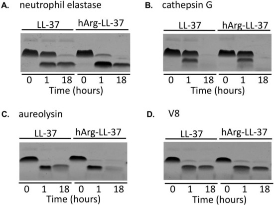Enhanced proteolytic activity is a hallmark of inflammation [17]. Given that hArg-LL-37 is a potential therapeutic peptide, it was necessary to determine its susceptibility to degradation by proteases. We compared the stabilities of LL-37 and hArg-LL-37 in the presence of host and bacterial proteolytic enzymes. LL-37 and hArg-LL-37 were incubated with two neutrophil-derived proteases, namely, neutrophil elastase and cathepsin G, for 1 and 18 h (Figure 3A,B). SDS-PAGE analysis showed that the susceptibilities of LL-37 and hArg-LL-37 to be degraded by cathepsin G did not differ (Figure 3B). However, hArg-LL-37 was degraded more rapidly by neutrophil elastase than LL-37 (Figure 3A). Conversely, the two peptides were similarly sensitive to proteolytic degradation by aureolysin and V8 protease (Figure 3C,D). Taken together, the sensitivities of LL-37 and hArg-LL-37 to proteolytic degradation did not differ in general, with the exception that hArg-LL-37 was more prone to cleavage by neutrophil elastase than the native peptide.