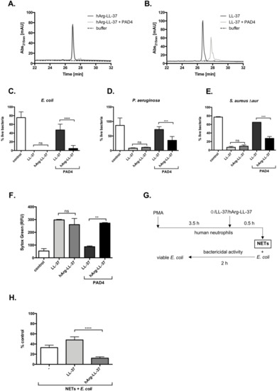 Citrullination abolishes the antimicrobial activity of native LL-37 but not hArg-LL-37. HPLC analysis of (A) hArg-LL-37 and (B) native LL-37. Samples containing 10 μg of LL-37 or hArg-LL-37 were treated with 233 mU of recombinant PAD4-HisTag for 2 h at 37 °C. Reaction was terminated by the addition of TFA and samples were analyzed via HPLC. Bactericidal effect of citrullinated LL-37 and hArg-LL-37 on (C) E. coli; (D) P. aeruginosa; and (E) S. aureus Δaur were determined using SYTO9 and PI staining, as described above. Citrullination of LL-37 and hArg-LL-37 was obtained by treatment of the native peptide and hArg-LL-37 with human PAD4 at 23.3 U/mg peptide. Mean ± SD n = 2. ns—non-significant; *** p < 0.001, **** p < 0.0001; (F) E. coli was mixed with either citrullinated or not citrullinated native LL-37 or hArg-LL-37 (50 μg/mL), followed by analysis of the inner membrane permeabilization by Sytox Green nucleic acid staining. Mean ± SD n = 2. ns—non-significant; ** p < 0.01; (G) The scheme presenting model of E. coli killing by PMA-derived NETs in the presence of LL-37 and hArg-LL-37; Antibacterial activity of LL-37 and hArg-LL-37 against E. coli was assessed in the PMA-induced NETs. Bacterial cells were exposed to NETs collected from PMA-activated neutrophils isolated from healthy donors supplemented with 25 μg/mL LL-37 or hArg-LL-37. After 2 h of incubation, suspensions were plated on agar plates for counting of bacteria. (H) The number of viable bacterial cells is expressed as a % of control with respect to the number of bacteria in the corresponding control samples (no stimulation). Mean ± SEM n = 3. **** p < 0.0001.