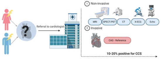 ACS is often quickly diagnosed with either an abnormal electrocardiogram (ECG) or elevated cardiac biomarkers, such as high-sensitive cardiac troponin (hs-cTn), indicating cell damage of the myocardium. Diagnosing CCS appears to be more complicated. Figure 1 provides an overview of the diagnostic workflow of a patient presenting with chest pain at the general practitioner and the diagnostic possibilities once referred to the cardiologist. The reference standard for CCS is still coronary angiography (CAG), but considering its invasive character, this is used with caution [,]. Currently, the most used noninvasive strategies are coronary computed tomography (CT) or myocardial perfusion imaging (MPI). The diagnostic accuracy of these different imaging modalities is relatively high (80–90%), but only 10–20% of symptomatic patients turn out to have CCS []. The low number of patients suffering from the actual disease are the result of an increasing use of these test modalities in the low-risk population [,,]. They are becoming more and more subject of debate because of unnecessary radiation exposure for the patient and high costs. A reliable, blood-based biomarker would therefore be important to improve the diagnostic strategy around patients suspected for CCS. Until now, no such biomarker exists.