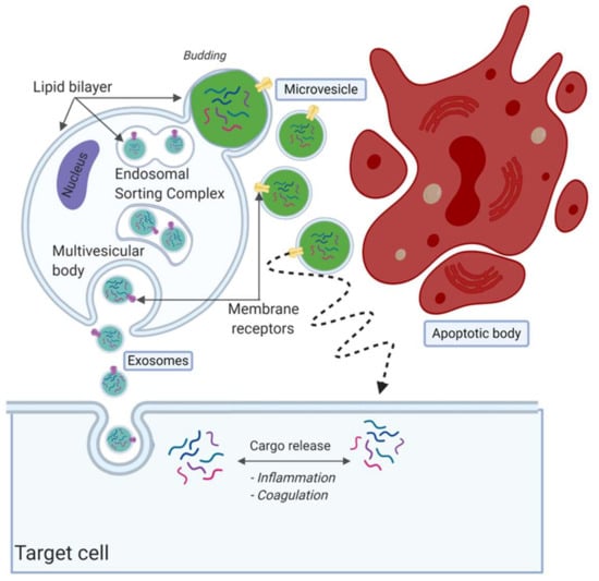 Although it is an ongoing debate regarding how to classify the EV subpopulations, EVs are often divided in three subtypes based on their size and formation route, namely, apoptotic bodies, microvesicles and exosomes [,,] (Figure 2). There is no consensus on specific identifying protein markers to distinguish between the three subpopulations [,,]. Exosomes are considered as the smallest particles in the EV family, with a size of 30–150 nm []. The release and formation of exosomes is via the endosomal sorting complex release transport (ESCRT) pathway []. They are formed as intraluminal vesicles and mature into multivesicular bodies (MVBs) []. MVBs fuse with the outer plasma membrane to be released within the extracellular space []. It was suggested that multiple subpopulations of exosomes exist, potentially providing additional information on their origin and role []. Microvesicles are EVs that form by outward budding, sometimes called blubbing, of the cell membrane. Their size is approximately between 100 nm and 1000 nm [,,,,]. The last subpopulation of EVs are the apoptotic bodies, which are released after cell death. They are >1000 nm in size and relatively large compared to exosomes and microvesicles.