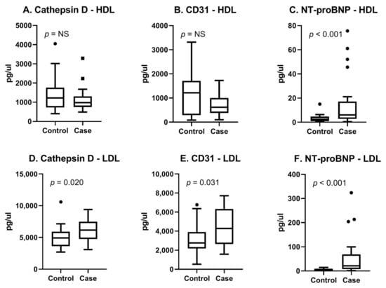 The myomarker study cohort consisted of consecutive patients presenting with stable chest pain at the outpatient clinic of the Meander Medical Centre in the Netherlands. Details on the study design and study population can be found in a previous publication []. For this study, a case control analysis of 44 men suspected of CCS was performed. Cases were defined as patients with stress-induced ischemia determined with MPI. Controls were matched based on age and general cardiovascular risk factors (Supplementary Table S1). In this cohort, we performed proteomics on EV subpopulations (rather than a total EV population) based on density since we hypothesized that this would provide a more detailed view of the cell condition. For this, we separated two subpopulations (called the HDL subpopulation and LDL subpopulation, respectively), as described in the study of Wang et al. []. We analyzed in the HDL- and LDL subpopulations using both the cardiometabolic panel as well as the cardiovascular III panel (Olink, Proteomics, Uppsala University Sweden). Each panel consisted of 92 proteins known for their associations with CVD. We identified the three most promising proteins (Cathepsin D, CD31 and NT-proBNP) based on literature, their diagnostic properties, and the availability of antibodies (Supplementary Table S2). Using the Meso Scale Discovery (MSD, Rockville, MD, USA) immunoassay, we confirmed our findings. Figure 3A–C shows boxplots of the MSD results for the selected three proteins in the EV-HDL subpopulation. The results for the LDL subpopulation are summarized in Figure 3D–F. It can be appreciated that in the EV-LDL subpopulation, protein levels of Cathepsin D, CD31 and NT-proBNP were significantly higher in cases compared with controls. In the HDL subpopulation, only NT-proBNP-protein levels were found to be significantly different between cases and controls. Our results therefore show the potential of using the Olink technology for the enrichment of EV proteins in EV subpopulations, followed by confirmation in an established immunoassay.