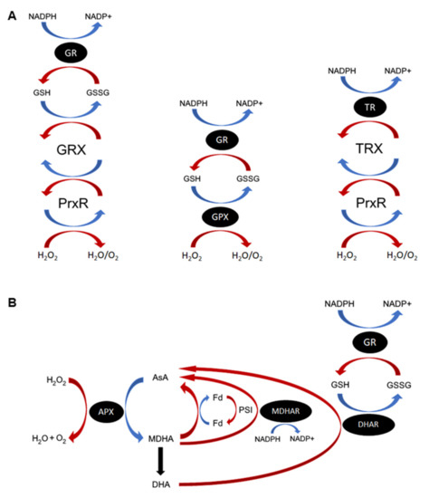 Important reactive oxygen species (ROS) antioxidant enzymes and cycles. (A) Functions of the glutathione (GSH), glutathione peroxidase (GPX), thioredoxins (TRX), and glutaredoxins (GRX) proteins in ROS homeostasis. GPXs and peroxiredoxins (Prxs) detoxify cellular H2O2 using different electron donor substrates. GPX causes oxidation of GSH to GSSG directly, resulting in production of H2O and O2. Reduced GSH is regenerated through the action of glutathione reductase (GR). Prxs are oxidized by H2O2, producing H2O and O2. Depending on the Prx, it then reduces either GRX or TRX. Oxidized GRX is nonenzymatically restored by GSH, which is oxidized to GSSG and in turn regenerated by GR using NADPH. Thioredoxin is regenerated by the related TRX-specific reductase (TR). In plant chloroplasts, TRX is also reduced by a ferredoxin-dependent TR (FTR). (B) The plant AsA–GSH cycle. H2O2 is reduced to water and oxygen through the action of ascorbate peroxidase (APX) and oxidation of AsA, producing the monodehydroascorbate (MDHA) radical. MDHA either spontaneously degrades, producing dehydroascorbate (DHA), or is converted back to ascorbate by MDHA reductase (MDHAR) and NADPH. In the chloroplasts, reduction of MDHA occurs primarily through PSI-photoreduced ferredoxin (reFd). DHA is converted to AsA by DHA reductase (DHAR) using GSH as an electron donor, producing oxidized GSH (GSSG). Reduced GSH is replenished by glutathione reductase (GR). In nonphotosynthetic organisms, AsA is replenished directly by GRXs and other antioxidants in the GSH–GR cycle. Oxidation reactions are coloured blue, whereas reduction reactions are red.