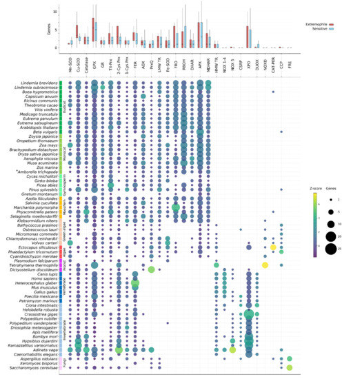 The aim of this study was to compare the ROS gene network across Eukaryotes and additionally between species tolerant and sensitive to extreme conditions (Table A1). Genome sequencing projects have been performed on a range of model Eukaryotic species and, over the past few years, genomes from extremotolerant species, particularly resurrection plants, have also become available [41,44,45,46,47,48]. However, relatively few genomes have been sequenced from fungi, protists and nonangiosperm plants (mosses, lycophytes and ferns) at this time [49,50]. In total, we analyzed the genomes of 37 plants (including eight extremophiles) and 28 nonplant species (including eight extremophiles). For the sake of this study, putative homologs are identified using the common names for the gene family (e.g., NOX, GPX). However, as these genes are identified by homology alone, there is no guarantee that they are functional or that the method of action is the same as those typically found in model organisms. In addition, the absence of an orthologue related to a chemical pathway in an organism does not necessarily imply that that organism is unable to catalyze that reaction—it could instead be achieved through species, or lineage-specific homologues or redundant mechanisms.