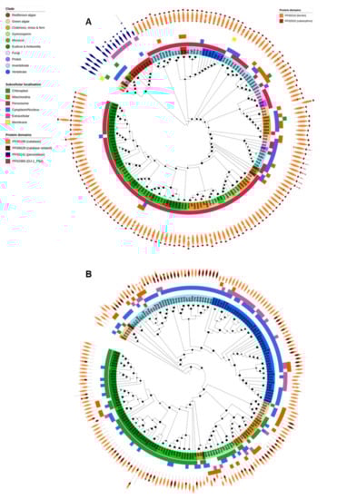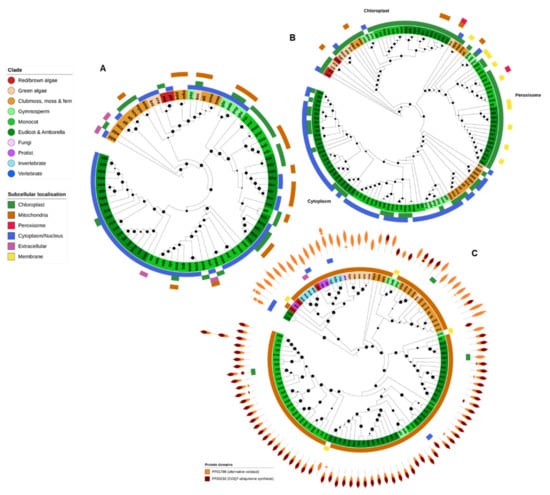 Dehydroascorbate reductase (DHAR), monodehydroascorbate reductase (MDHAR) and alternative oxidase (AOX). Dehydroascorbate reductase (DHAR) (A), together with monodehydroascorbate reductase (MDHAR) (B) are involved in ascorbate recycling during photosynthesis. As such, both gene families were found predominantly in photosynthetic organisms. DHAR from gymnospermms, eudicots and monocots were found in a separate clade to algae, moss and ferns, and further divided into chloroplastic and cytoplasmic forms. Complex plants generally contained at least three MDHAR variants (chloroplastic, peroximsonal and cytoplasmic) whereas algae contained only one. CELLO was unable to identify peroxisomal targeting motifs for the peroxisomal clade, which were instead predicted to be chloroplast and/or membrane. (C) AOX genes were found predominantly in algae and plants, with some additional examples in some stramenopiles, invertebrates and fungi. Nearly all AOX proteins were predicted to be mitochondrial. Maximum-likelihood phylogenetic trees were calculated using FastTree with default settings, and visualized together with PFAM and CELLO data using EMBL Interactive Tree of Life (https://itol.embl.de/).