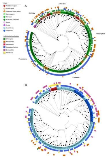 On the other hand, plant APX proteins clearly clustered into four classes corresponding to the Arabidopsis thaliana APX6-like, chloroplastic (thylakoid and stroma), peroxisomal and cytosolic forms (Figure 5A). The chloroplastic form was found across all photosynthetic organisms—red/brown algae, green algae, and lower and higher plants. APX6-like APXs were similarly found throughout the plant kingdom but were specifically absent from gymnosperms. Peroxisomal and cytosolic APXs were found only in plants, except for a single K. nitens protein. CELLO was unable to detect peroxisomal targeting in the genes from this clade, though there is substantial evidence that these genes are targeted to peroxisomes.