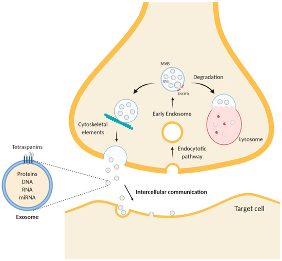 Schematic diagram of exosome trafficking in a neuron. While multivesicular bodies (MVBs) undergo a maturing process, the composition of the intraluminal proteins is gradually changed. The endosomal sorting complex required for transport (ESCRT) remodels the inner membrane of MVB to generate the intraluminal vesicles (ILVs), which represent exosomes inside the MVBs. After intracellular translocation mediated by cytoskeleton elements, such as F-actin, and microtubules, MVBs merge with the plasma membrane and undergo exocytosis. Alternatively, MVBs can fuse with lysosomes to degrade themselves. Exosomes contain in their lumen free proteins, RNA, microRNA, and DNA and are characterized by transmembrane proteins of the tetraspanins family.