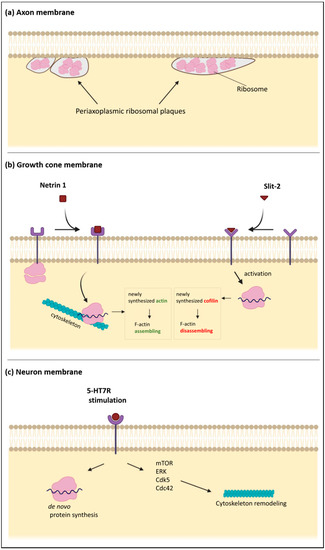 Schematic diagrams of the subplasmalemmal regions in specialized neuronal compartments. (a) the axonal plasma membrane is associated with “periaxoplasmic plaques”, which contain ribosomes and therefore serve as a center for intra-axonal protein synthesis. (b) The plasma membrane of the growth cones contains receptors for various guiding cues. When netrin-1 receptor DCC (Deleted in Colorectal Carcinoma) is bound by netrin, the sequestered ribosomes are released from the membrane and move to the unspecified cytoskeleton, which may serve as a scaffold for protein synthesis. Translation of β-actin mRNA increases local concentration of β-actin, which leads to enhanced F-actin polymerization. Binding of a repulsive guidance cue slit-2 has the opposite effect because of the increased local translation of cofilin, an actin-binding protein. (c) Stimulation of the serotonin receptor 7 (5-HT7R), localized in the neuronal plasma membrane, promotes de novo protein synthesis and activation of several signaling pathways such as ERK, Cdk5, Cdc42, and mTOR. These intracellular pathways converge to promote reorganization of the neuronal cytoskeleton, including microtubules and actin filaments.
