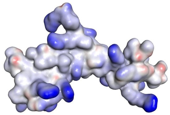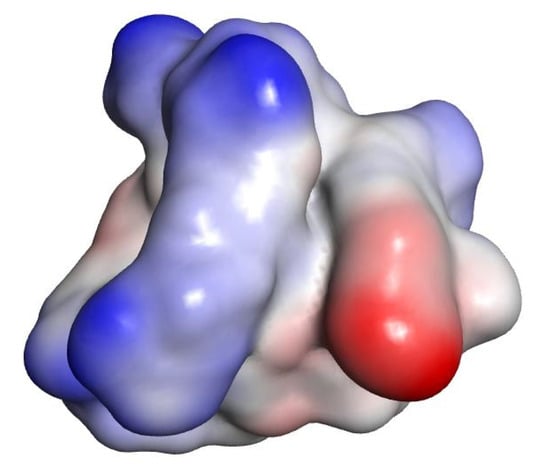 MEP of the representative complex formed by one compound 6 (WRWRW-NH2) and three norfloxacin molecules. Negative values are shown in red, hydrophobic regions in grey and positive values in blue.