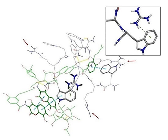The interactions between peptide and antibiotic molecules were analyzed (Figure 4 and Figure 5). It was observed that the formation of antibiotic-peptide complexes occurs with both antibiotics. In particular, for the complex observed between norfloxacin and compound 6, the norfloxacin quinolone rings form π-stacking interactions with themselves and with the indole ring of Trp1 and Trp3; two norfloxacin carboxylic acids form H-bonds with Trp3, Arg 4 and Trp5; a salt bridge can also be observed between the charged carboxylic acid of one norfloxacin and Arg4 (Figure 4).