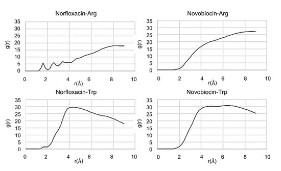 Plots representing the radial distribution function (RDF) patterns obtained from the trajectory of 50 ns MD simulation of a system containing peptide 6 (WRWRW-NH2) and either novobiocin or norfloxacin.