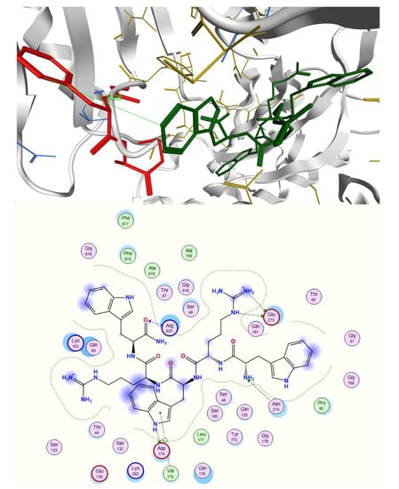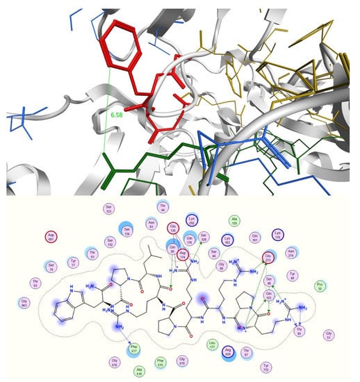 The most favorable pose of potentiating peptide 27, RPRRPRLPW-NH2 (green) establishes interactions with both the distal (yellow) and proximal (blue) binding pocket. Interactions can be observed with all four residues forming the loop (red) and in particular Arg6 (bold green) interacts with Phe617.