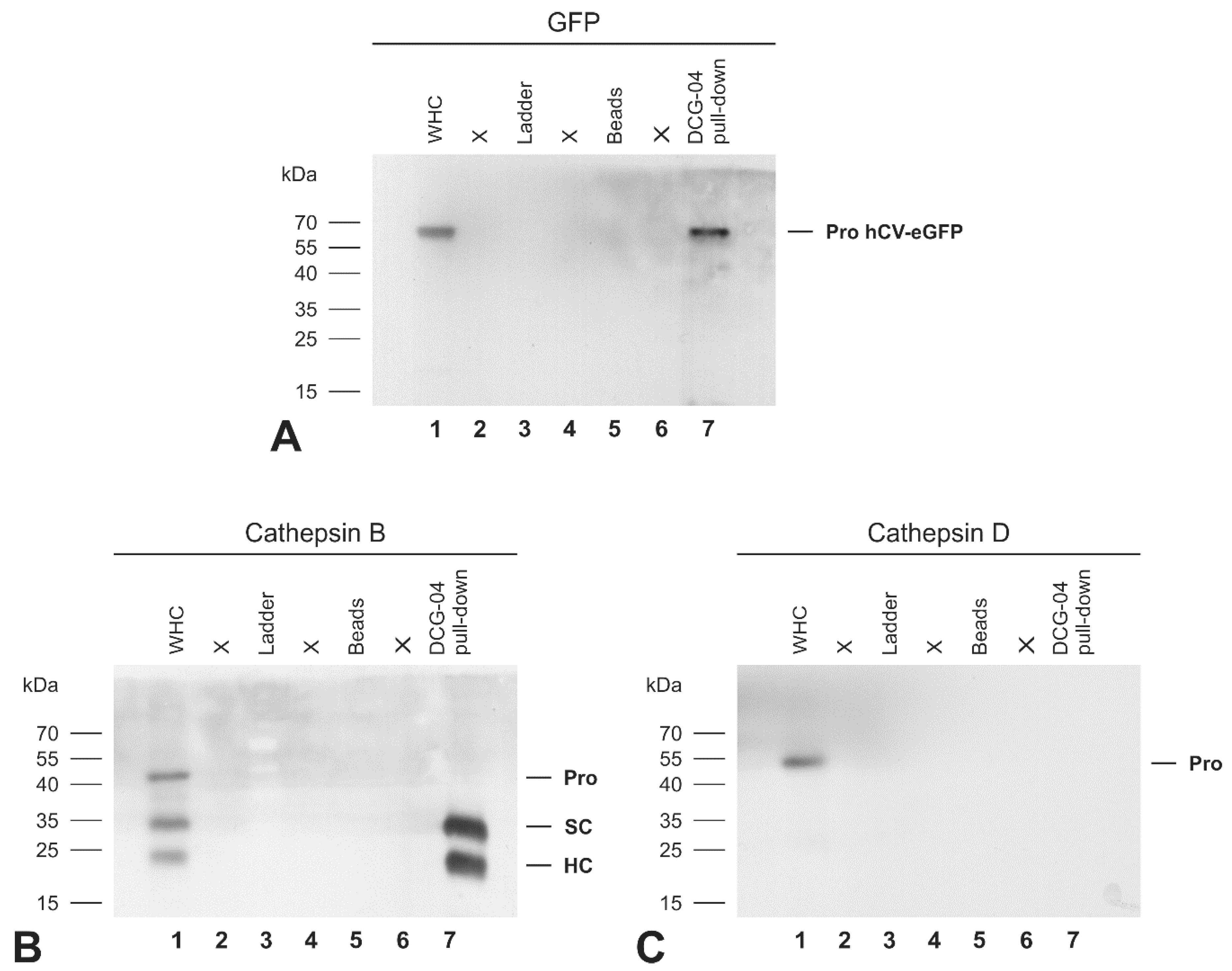 2.7. The Activity-Based Probe DCG-04 Recognizes the Proform of eGFP-Tagged Cathepsin V Chimeric Protein